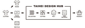 廃棄衣類を原材料として地域や企業と関わりながら、新たなものづくりをし